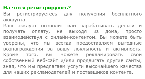 Организация обещает честные и якобы самые выгодные на рынке условия. При этом какая-либо конкретика отсутствует. Известно только, что любой пользователь может использовать систему для рекламирования собственного веб-сайта, получая дополнительную выгоду.