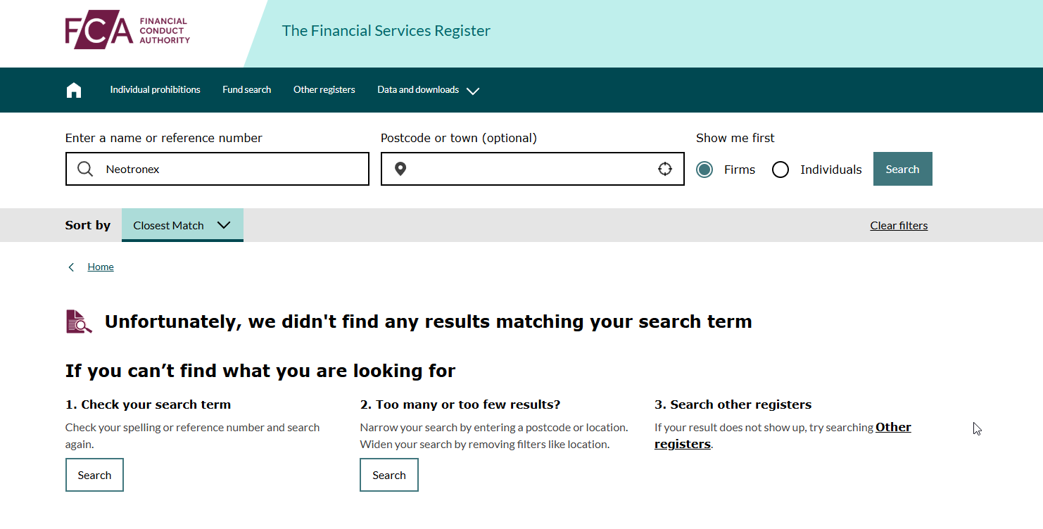 Неотронекс утверждает, обладает пропиской Великобритании. Собственно, здесь же находится и офис организации. Более того, брокер заявляет, что регулируется сразу несколькими организациями с мировым именем. Подтверждений этой информации на самом сайте нет. Поэтому мы решили заглянуть в реестр финансовой комиссии Ангилии (FCA), где имя брокера должно находиться обязательно, если работает он на территории Соединенного Королевства. В регистре FCA Neotronex не значится.