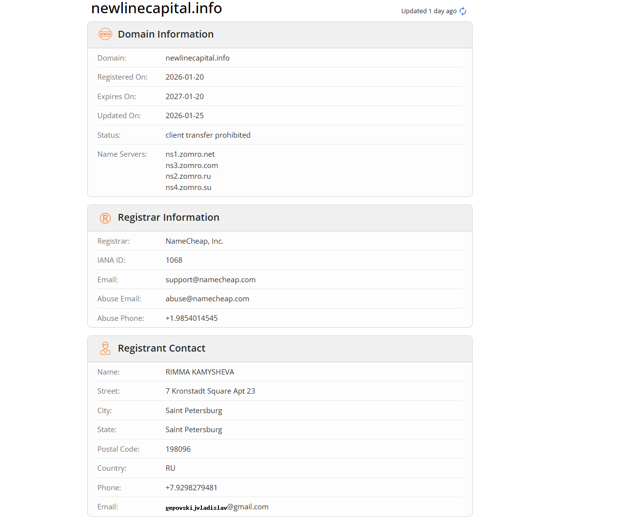 По данным Whois, домен проекта был создан в начале 2026 года через регистратор NameCheap. При этом на главной странице указывают на многолетний опыт, 50 000 клиентов и широкий рынок активов. Техническая часть NewLineCapital info построена на стандартном терминале UTIP, который встречается как у надежных компаний, так и у фейковых площадок.