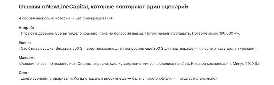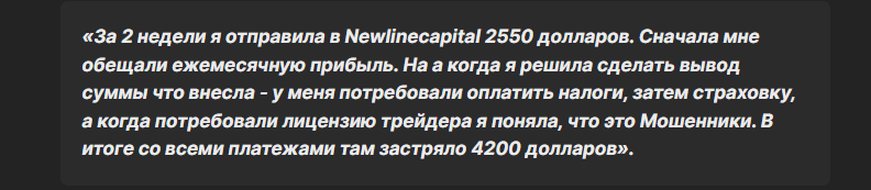 Также в отзывах пишут, что из-за сотрудничества с New Line Capital, люди потеряли много денег. Указывают, что во время работы условия регулярно менялись, спреды становились выше, а сделки автоматически закрывались. Обращение в поддержку не давало результата — пользователю просто отказывали в доступе. Также встречаются комментарии о навязчивых звонках менеджеров, которые уговаривали пополнить депозит, чтобы снять все деньги со счета.