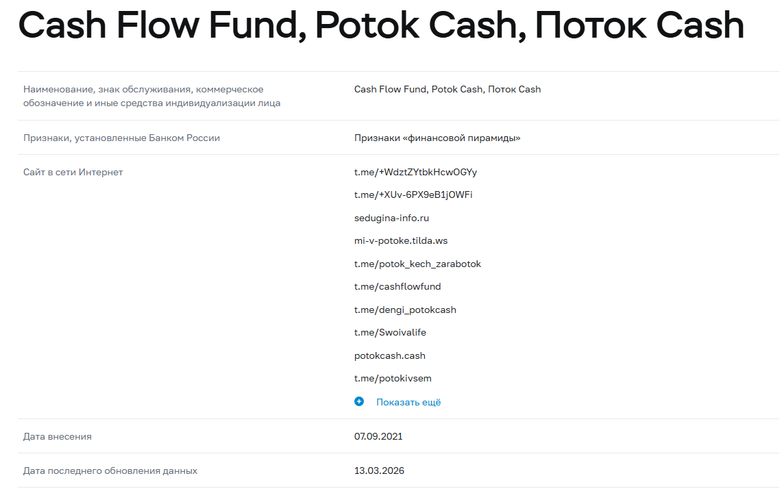 Newbie Flow работает на платформе Potok Cash, которую ЦБ РФ внес в черный список с пометкой «признаки финансовой пирамиды». В реестре указано несколько связанных доменов и телеграмм-каналов, работающих под теми же названиями Cash Flow Fund и Potok Cash.