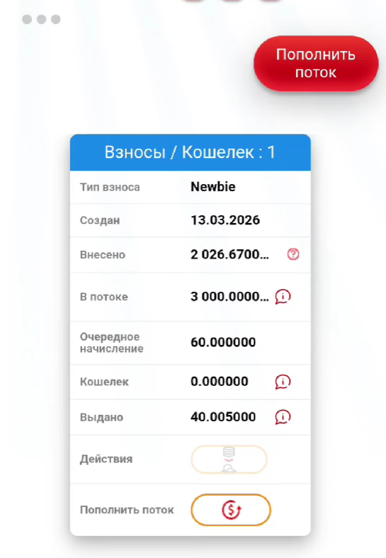 Минимальный взнос для входа в Newbie Flow составляет ₽2,000. По условиям, вложенная сумма находится в «потоке», а каждый день участник нажимает кнопку «Выплата» и получает начисление. Система работает 26 дней в месяц без воскресений. Часть начислений уходит обратно в поток, часть остается в «копилке» для вывода.