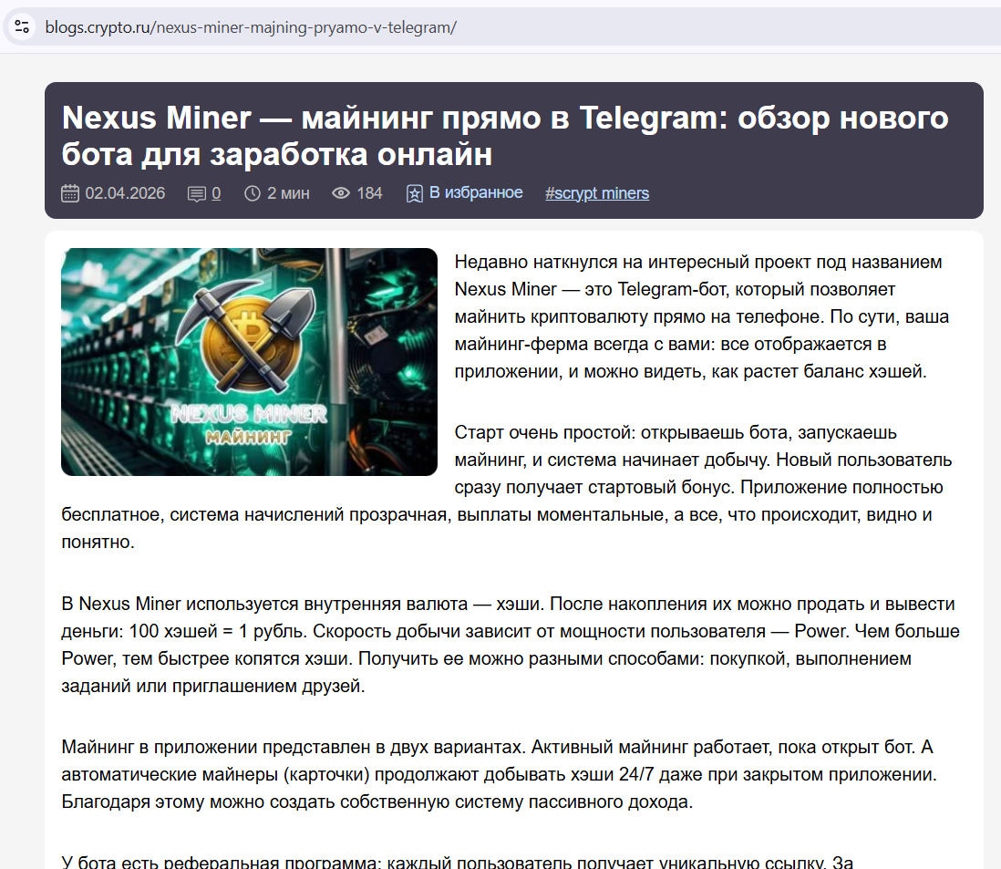 В блоге одного из сайтов, посвященных криптовалюте и связанных с ней проектов, опубликована статья “Nexus Miner — майнинг прямо в Telegram”, где автор описывает работу NexusMiner как бот, присылающий виртуальные монеты пользователю за активность и просмотры рекламы. В материале прямо указывается, что реального майнинга на железе нет — это gamified‑модель, похожая на “копилки” баланса внутри бота.