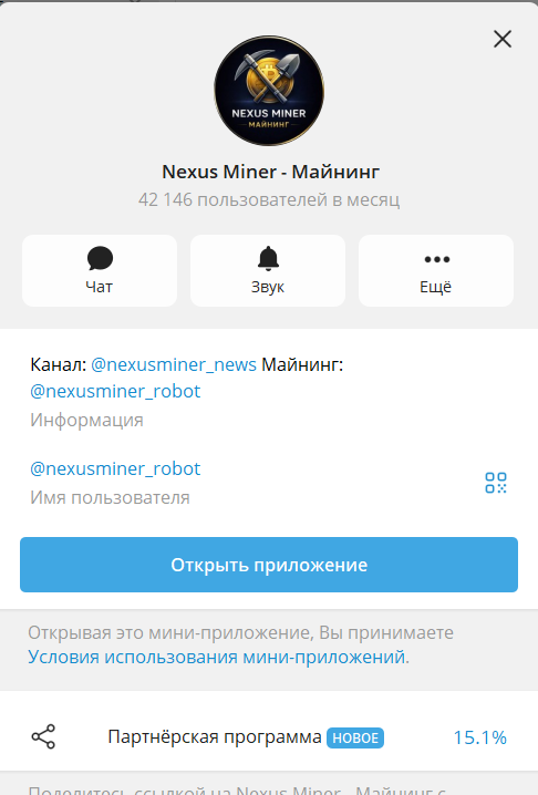 - в ТГ Nexus Miner работает только как бот, без официальной страницы, арбитража и публичного канала, что повышает риски для пользователей;