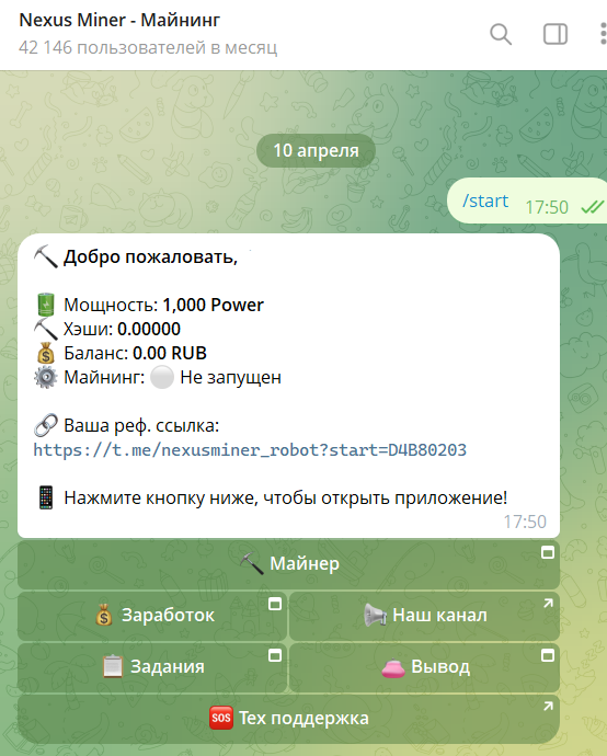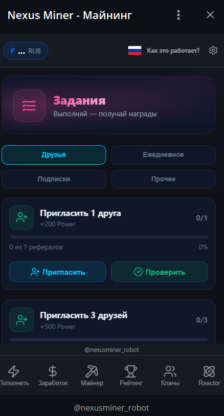 Особенность механики программы: Nexus Miner майнинг — это не классический майнинг ASIC/фармов, а условные начисления внутри бота. Пользователь получает баланс, который можно “добывать” через выполнение простых действий — клики, задания, приглашения друзей. Выплаты в реальную криптовалюту описаны как условные, с существенными ограничениями по выводу и комиссиям.
