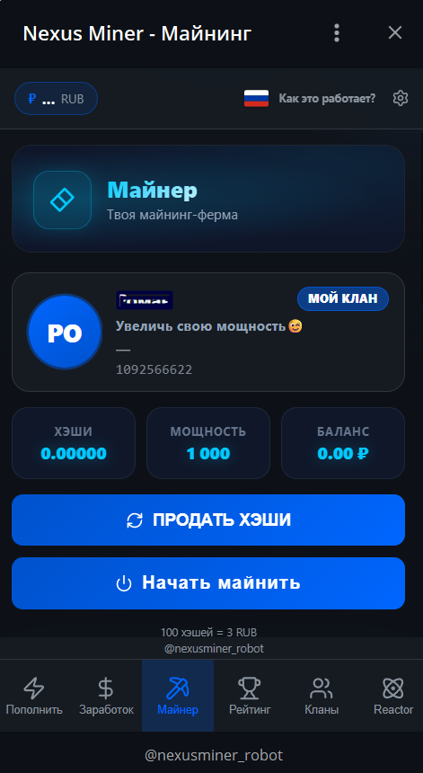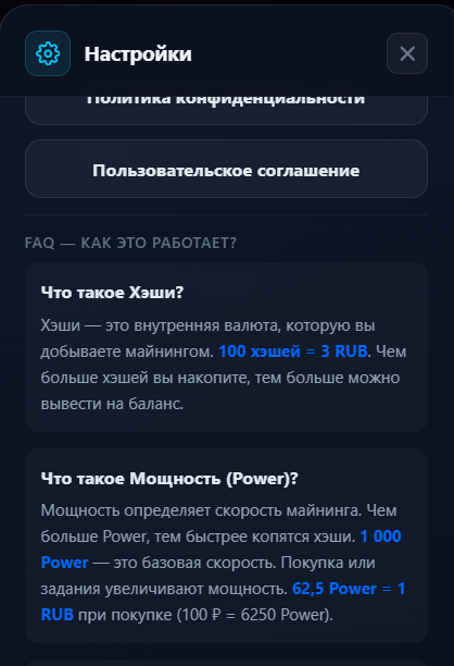 Мини-приложение запускается из бота.Новичку предлагаетсязарабатывать (майнить)внутреннюю валюту — хэши. Ускорить процесс добычи можно, купив Мощность за рубли, которые нужно внести на свой счет. Прибыль пользователя получается при продаже 100 хэшей за 3 рос. рубля. Более подробно можно прочитать в разделе FAQ.