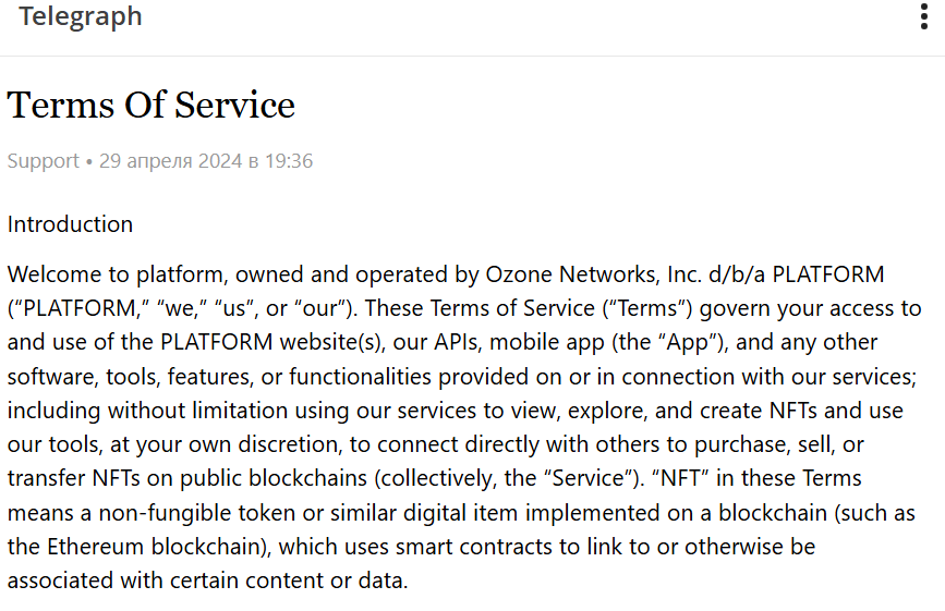 Владельцы проекта утверждают, что относятся к южнокорейской криптовалютной бирже UpBit, где есть маркетплейс Nft, но на сайте площадки нет упоминания об этом боте. После запуска можно посмотреть информацию о лицензии РФ на деятельность по цифровым активам, которую владельцы получили в 20.01.2025, хотя там написано про ФСФР, но она упразднена еще в 2013 году, а ЦБ ничего подобного не выдает. У бота с ником NftUpBit_bot есть «Пользовательское соглашение», но вместо названия проекта указано просто Platform.