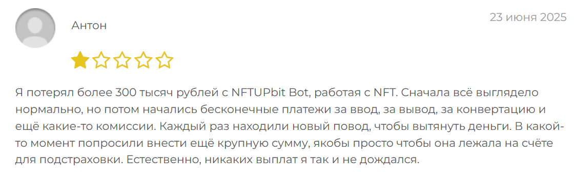 - Пользователи в отзывах об NftUpBit_bot жалуются на невозможность вывода средств без дополнительных платежей, что похоже на схему обмана.