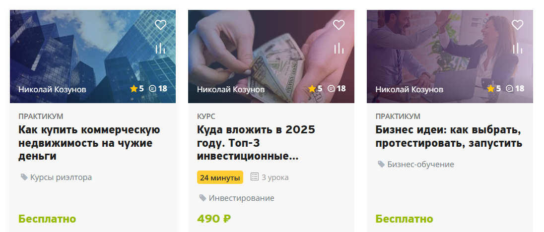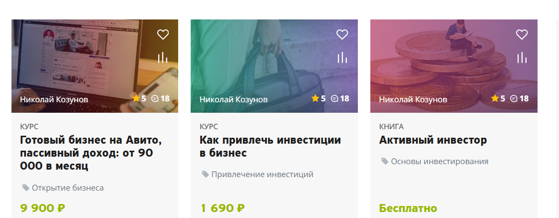 Козунов предлагает пройти его курсы по инвестициям в бизнес. Их стоимость варьируется от 490 до 9900 рублей. Самой дорогой его обучающей программой является “Готовый бизнес на Авито, пассивный доход от 90000 в месяц”. Она включает видеоуроки, pdf-пособие. Материал рассчитан для новичков. Сумму в 9900 рублей можно оплатить сразу или частями. Доступ к курсу после перевода денег открывается на бессрочной основе.