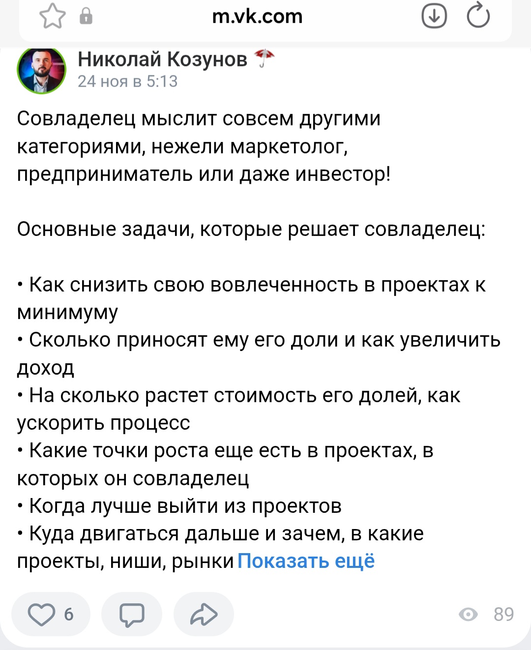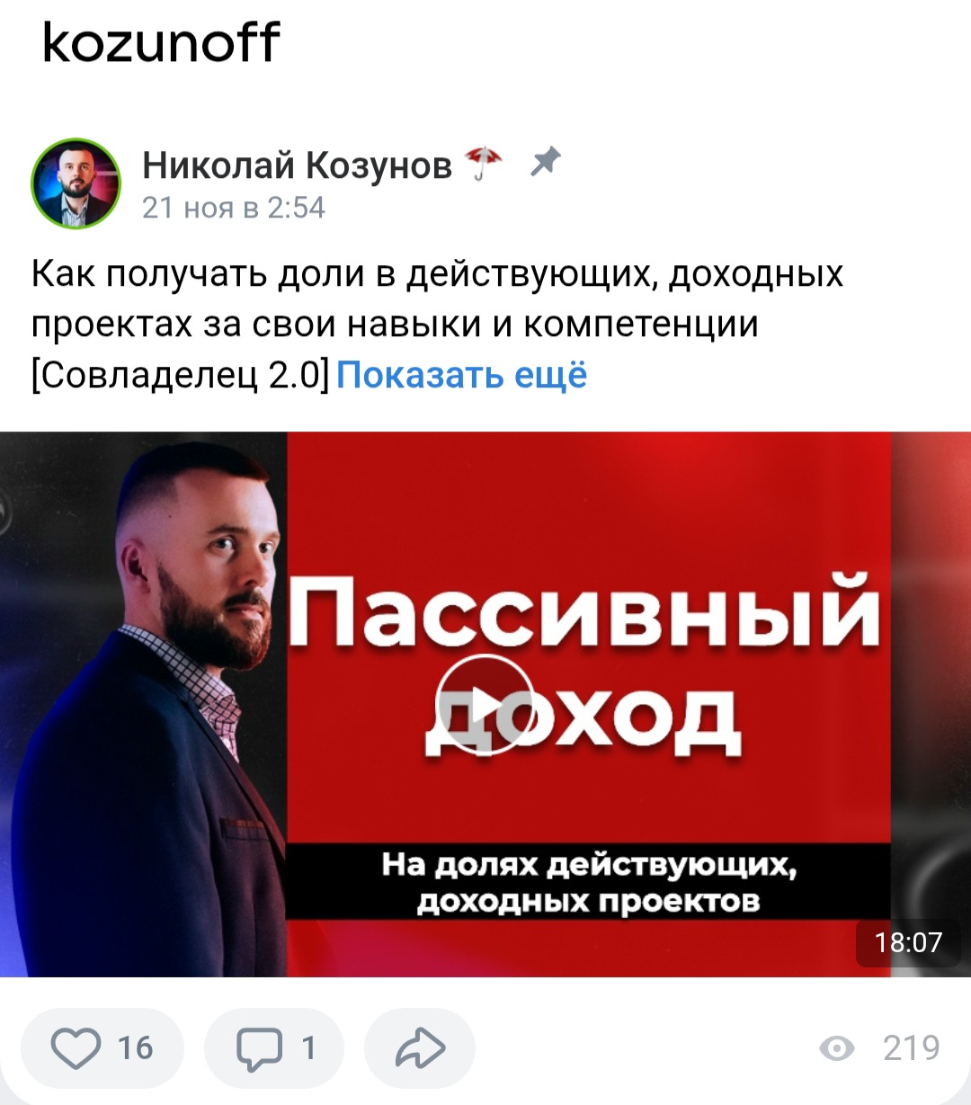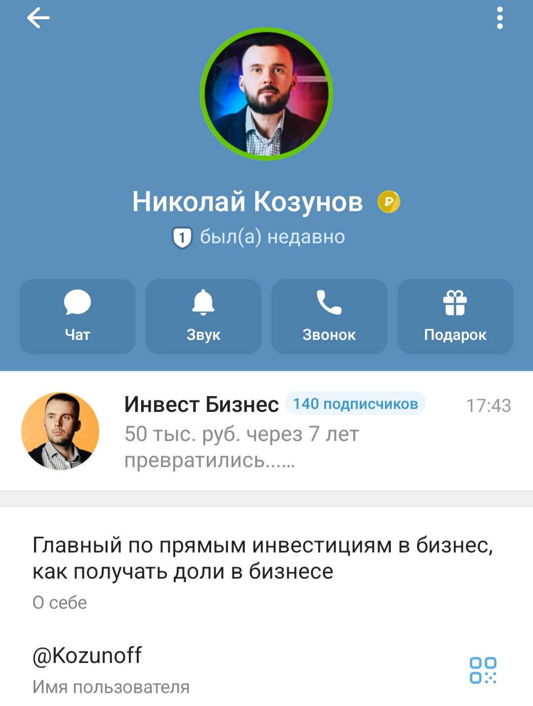 У Николая есть личная страница в Телеграмм, зарегистрированная под ником kozunoff. На аватарке выложена его личная фотография. В описании он называет себя главным по прямым инвестициям в бизнес, дает ссылку на свою группу в ТГ “Инвест Бизнес”.