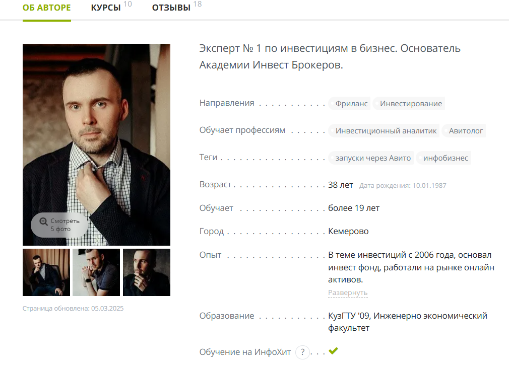 Николай Козунов представляет себя как эксперта №1 в области заработка на инвестициях. Родом он из Кемерово. Ему 38 лет. Он имеет высшее образование: закончил КузГТУ по инженерно-экономической специальности. С 2006 года зарабатывает на инвестциях. Является основателем академии Инвест брокеров. Около 19 лет занимается обучением тех, кто хочет начать получать пассивный доход от инвестиций без больших вложений. Его курсы размещены на Info hit и Avito.