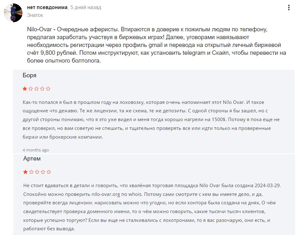 Хотя брокер Nilo Ovar работает недолго, отзывы о нем уже есть в большом количестве. В них пользователи рассказывают о схеме развода, которую прокручивают мошенники.
