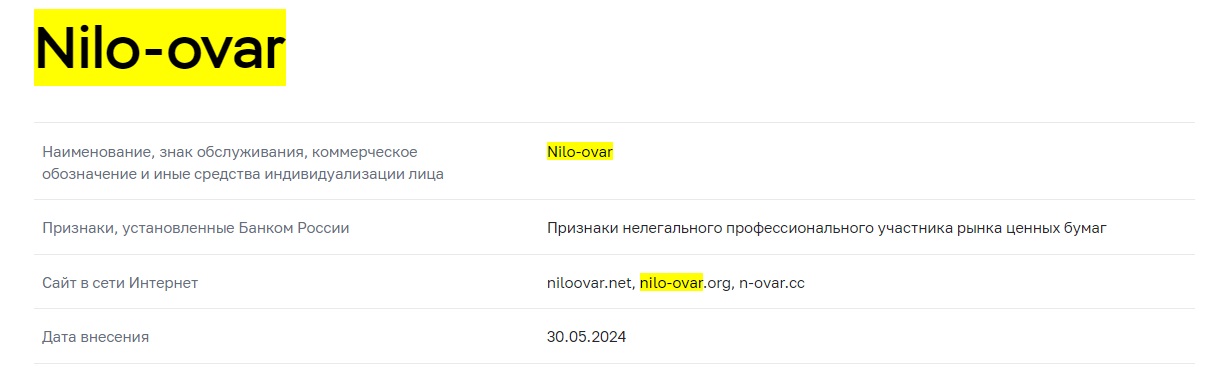 Поскольку основной язык платформы Нилоовар.нет русский, то она ориентирована на российских пользователей. Чтобы работать на территории РФ, необходимо получить разрешение Центрального банка. Проверка показала, что такая компания не только не получила лицензии, но 30 мая 2024 года была внесена в черный список ЦБ РФ по признакам нелегального участника рынка ценных бумаг.