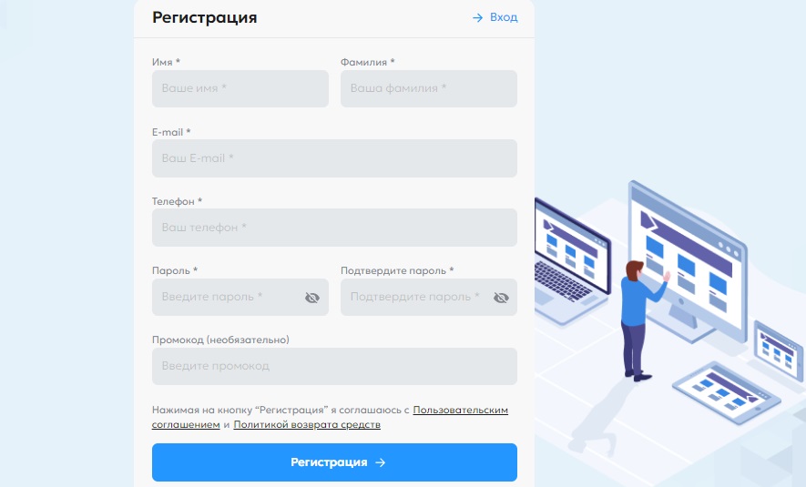 Для начала работы, необходимо пройти регистрацию, но в ее форме есть поле с промокодом, хотя оно отмечено как необязательное, без его заполнения невозможно завершение.