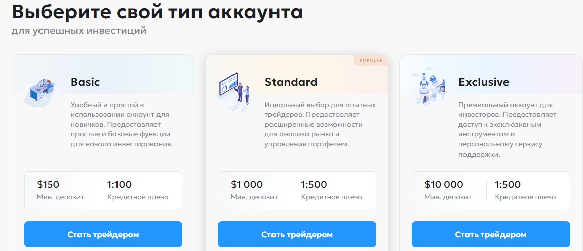 На платформе клиентам предлагают три варианта торговых счетов, минимальный стартует со 150 долларов, кредитное плечо 1:100 или 1:500.