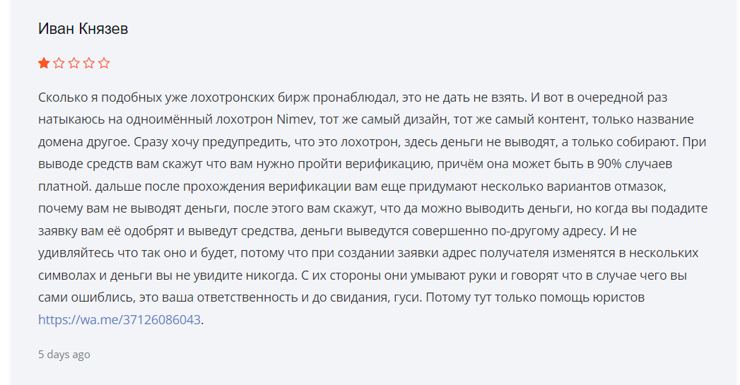 Мы не рекомендуем сотрудничать с биржей Nimev, поскольку очень многие негативные отзывы и комментарии в сети, а также отсутствие реальной поддержки и легальной деятельности указывают на очень большую вероятность потери дохода.