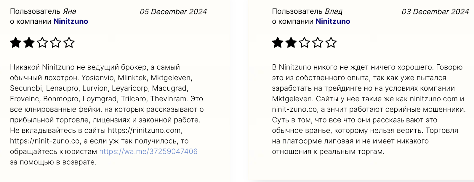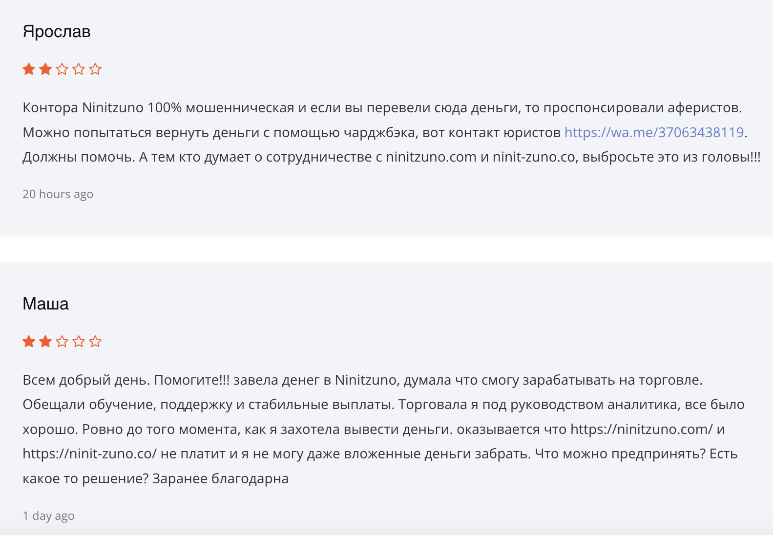 - Большое количество негативных отзывов о ninitzuno от пользователей с обвинениями в мошенничестве;