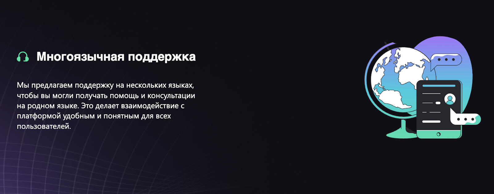 - Функционирование профессиональной поддержки на разных языках.