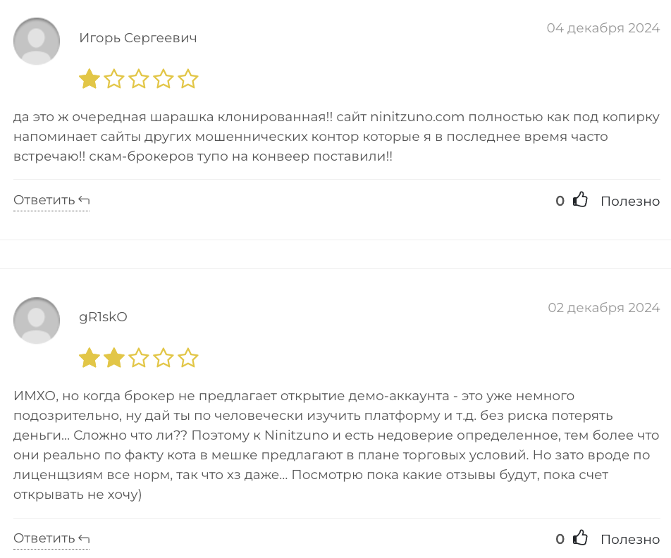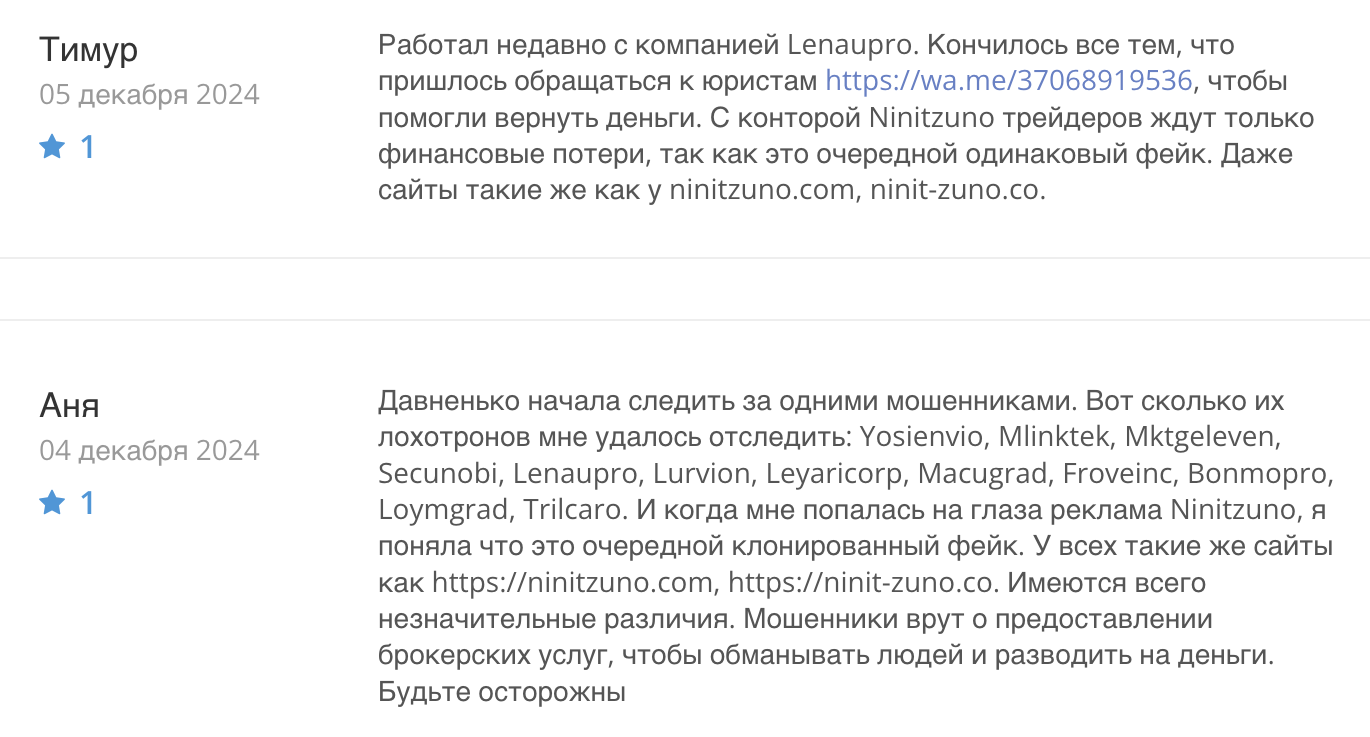 В открытых интернет-ресурсах опубликовано 10 негативных отзывов о брокерской площадке ninitzuno com. Пользователи отмечают низкий уровень обслуживания и сообщают, что брокер Ninit zuno фейковое кидалово на деньги. В 5 отзывах обманутые трейдеры утверждают, что ninitzuno co клонированная площадка по образцу других финансовых пирамид, например Lurvion.