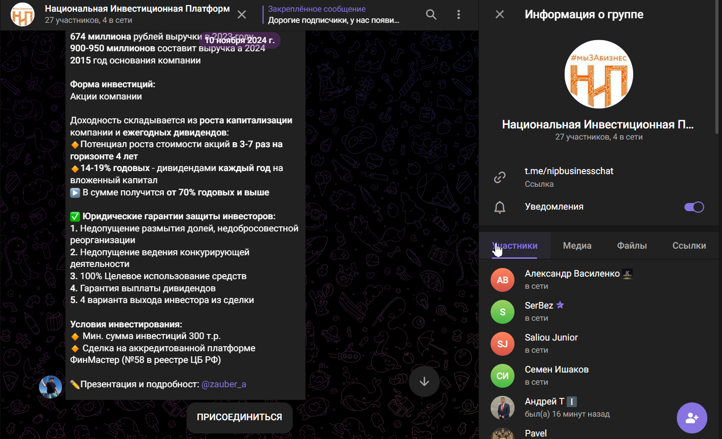 Финансовая организация «НИП РФ» рекламирует свои услуги через популярные соцсети и мессенджеры. Например, с 2021 года в Телеграмм зарегистрирован чат NipBusinessChat. Последнее сообщение здесь оставлено в 2024 году – мотивирующее инвестировать в компанию «РусДверь». На август 2025 года в чате осталось всего 27 человек.