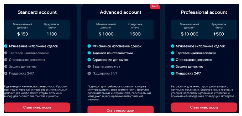 - Advanced от $1 000, плечо до 1:500, расширенная линейка активов.