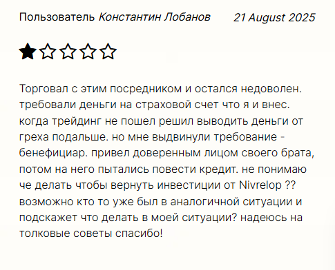 В специализированных сообществах и на тематических площадках про Nivrelop пишут в основном плохо. Жалобы повторяются из раза в раз. Чаще всего речь о деньгах: задержки и отказы в выводе, требования «доплатить» за некие технические сборы или «налоги» для разблокировки средств. Есть и претензии по операциям: закрытие прибыльных позиций без объяснений, странные котировки в периоды волатильности, «сбои» в критические моменты. Поддержка support@nivrelop pro, по словам пользователей, не помогает: отвечает шаблонно или игнорирует обращения. Отдельная тема – условия торговли: компания меняет их в одностороннем порядке, всплывают скрытые комиссии, о которых изначально не было речи. В сумме это формирует устойчивый негативный фон и высокий репутационный риск работы с этим брокером.