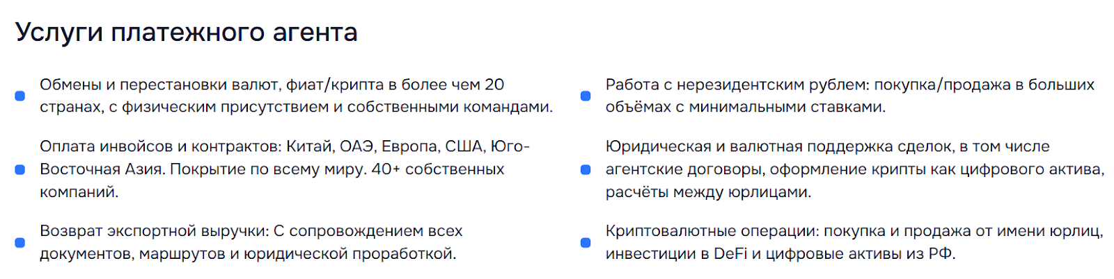 Сервис предлагает разные услуги по валютным переводам вроде проведения оплаты в Китай за товары, автомобили и крупные сделки. Также в числе якобы популярных направлений: