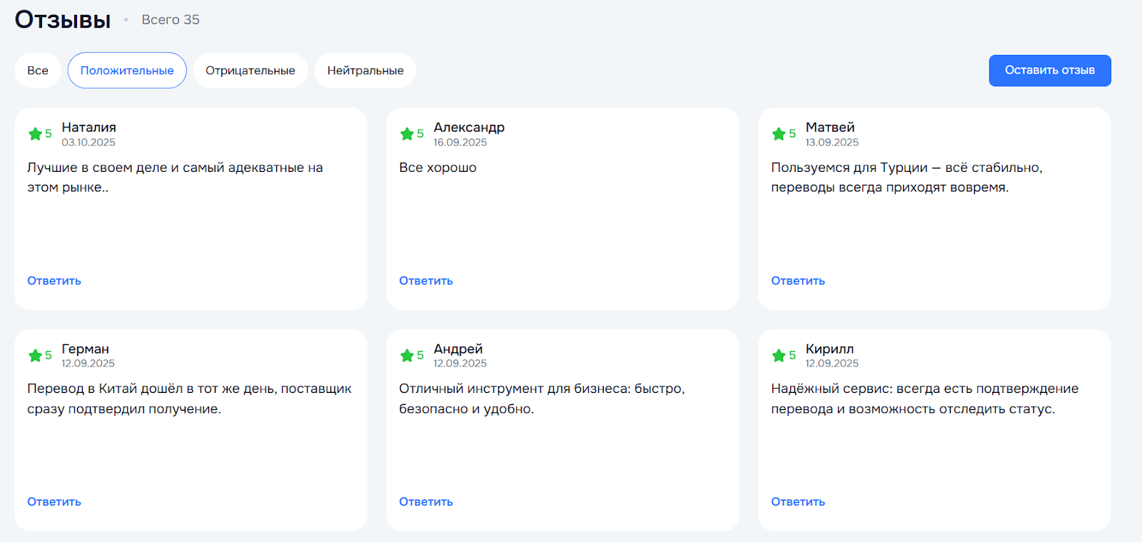 На март 2026 года отзывы о платежном агенте Nnex есть только на сайте Exnode. Всего их 35, все положительные – нет даже нейтральных, не то что негативных. Довольные клиенты утверждают, что переводы всегда проходят, а сам сервис как нельзя лучше подходит для ведения бизнеса.