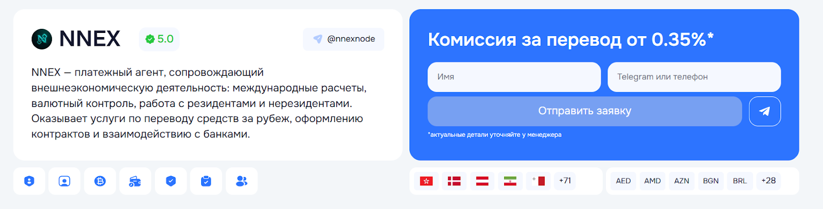 «Ннекс» позиционируется международным платежным агентом, который специализируется на трансграничных переводах для бизнеса и частных лиц из России и СНГ. Сервис якобы является надежной альтернативой банкам в условиях санкций. Платежный агент Nnex обещает низкие комиссии и выгодные решения для оплаты: