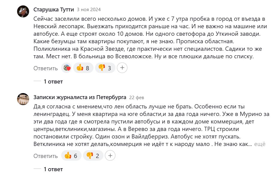 - в отзывах Новосаратовку в СПб критикуют, что указывает на низкую заинтересованность в инвестициях;