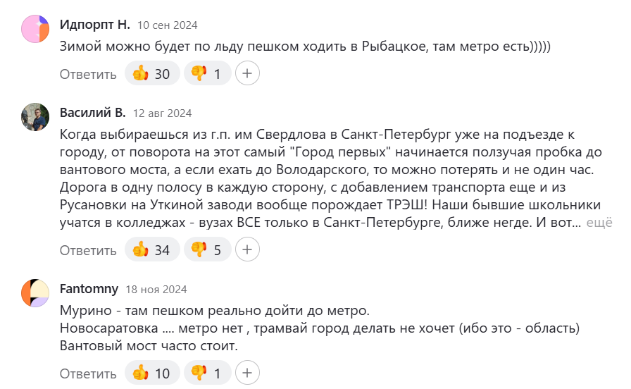 Отзывы инвесторов не прибавляют уверенности в возможности заработка на недвижимости в Новосаратовке. Кто-то шутит, что зимой можно будет сократить дорогу до Рыбацкого пешком по льду. Другие справедливо отмечают отсутствие метро, трамвайных путей.В 2024 году, когда в деревне было заселено всего несколько домов, жители уже жаловались на пробки. Чтобы добраться до города, им приходилось выезжать за час. Авторы также отмечают плохую инфраструктуру – единственную поликлинику, в которой текучка кадров, отсутствует достаточного количества детских садов и пр.