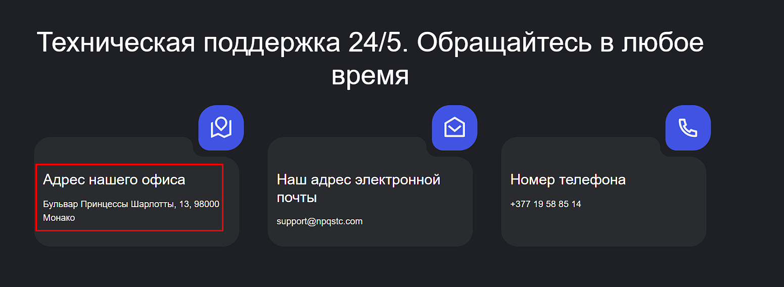 Владельцы торговой платформы Npqstc заявляют о регистрации в Монако по адресу 13 Boulevard Princesse Charlotte, 98000 и наличии местной лицензии. В реальности же адрес фейковый, сведений о компании в реестре княжества мы не обнаружили. Это еще раз подтверждает тот факт, что перед нами очередная нелегальная «кухня».