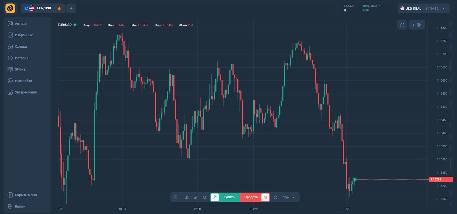 На платформе O Dorgo me по центру находится график с японскими свечами, внизу кнопки «Купить» и «Продать».