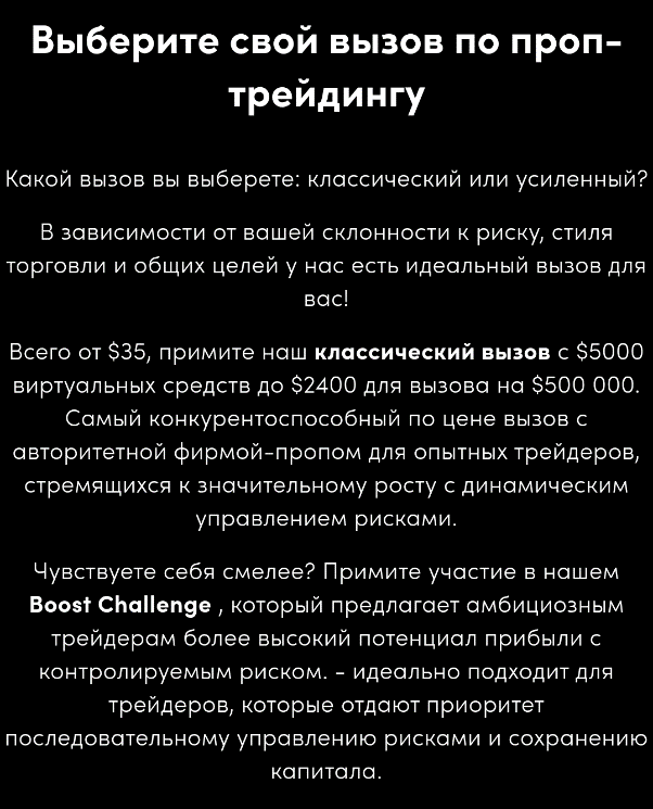 Чтобы сотрудничать с «Оанда Проп» и стать ее квалифицированным трейдером, нужно пройти «классический вызов», а допуск к такому вызову требуется купить. Внесение средств необходимо сразу при регистрации. От того, на какую сумму пользователь пополнил баланс, будет зависеть его дальнейшее финансирование.