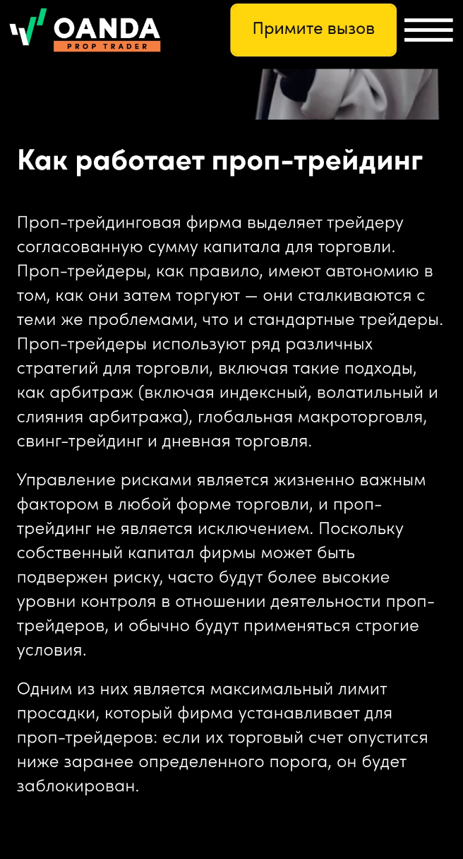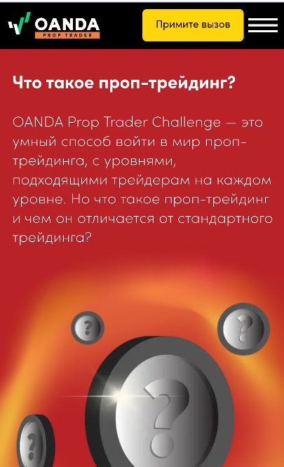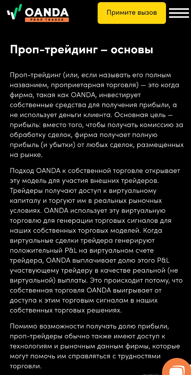 Проект Oanda Prop Trader появился в январе 2024 года. Суть проп-трейдинга в том, что инвесторы могут прокачивать навыки и совершать сделки, используя капитал компании. Торговля идет в реальных условиях рынка. Главным преимуществом компания считает «Программу распределения прибыли». Именно она дает трейдерам доступ к счетам площадки, поддержка и возможность получать долю прибыли с минимальными рисками.