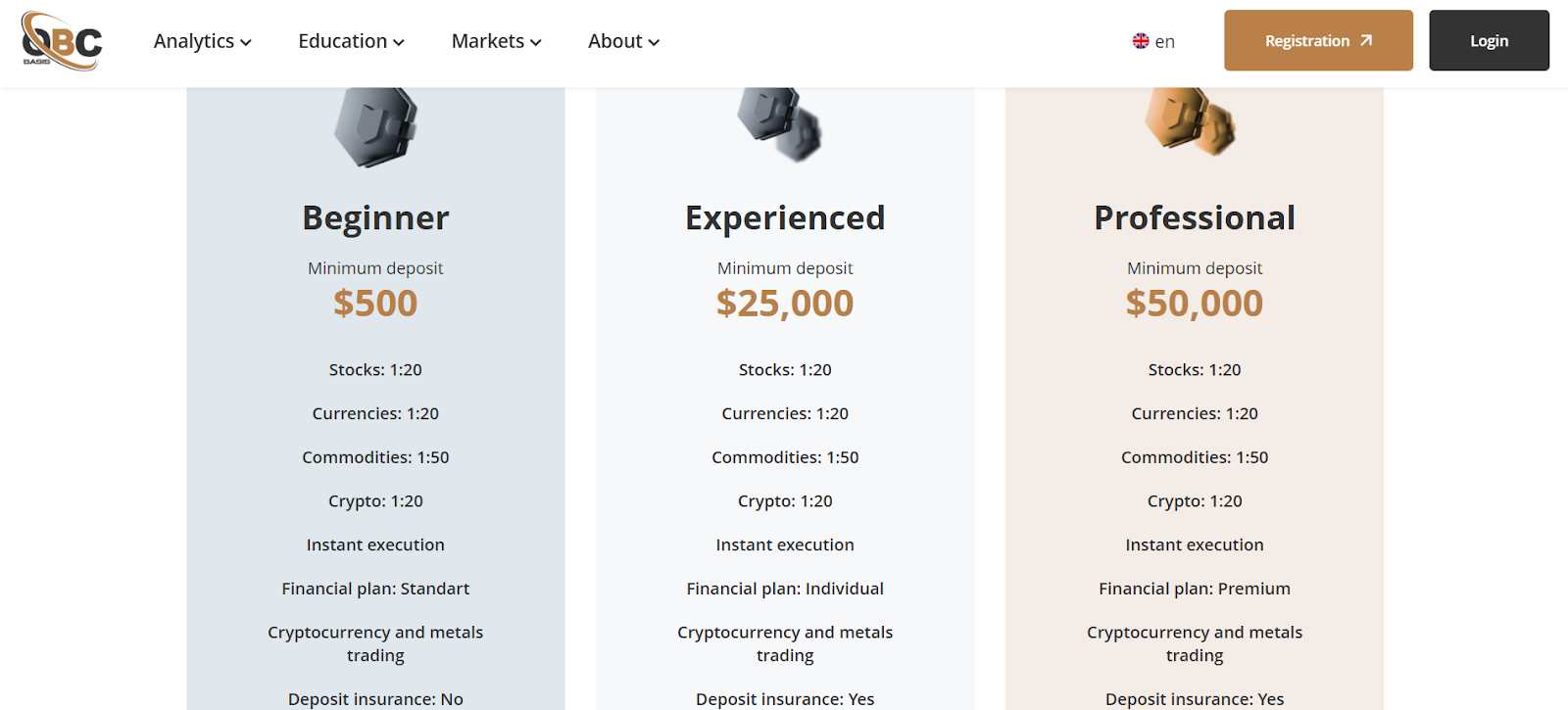 Брокер OBC basis предлагает 3 тарифа для работы на платформе: