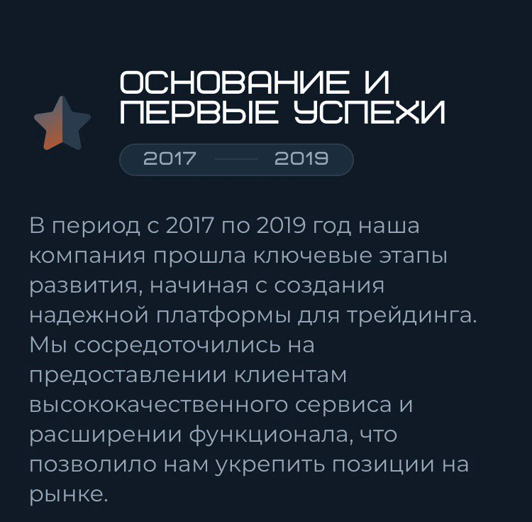 По словам создателей, пожелавших остаться неизвестными, компания запущена в 2017 году и с тех пор стремительно развивается. У фирмы 4 лицензии, и работает она честно и прозрачно. Сказано, что компания неоднократно получала призы в номинациях за честность, лучшего брокера и самые лучшие торговые условия. Но ни одного подтверждающего сертификата не представлено.