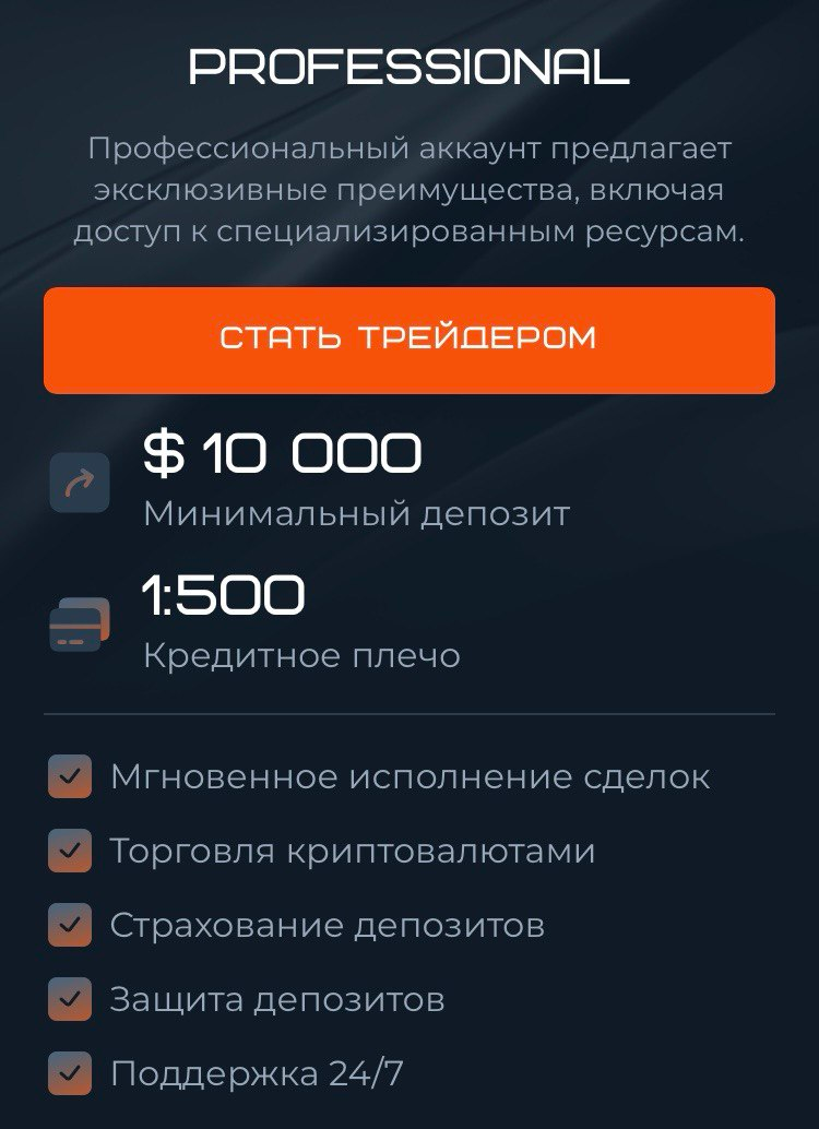 - Последний тариф для профессиональных инвесторов, минимальный взнос составляет 10 тысяч долларов, плечо также 1 к 500.