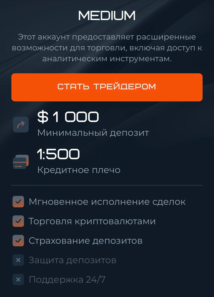 - «Медиум», минимальная сумма пополнения счета – 1 000 долларов, плечо 1 к 500.