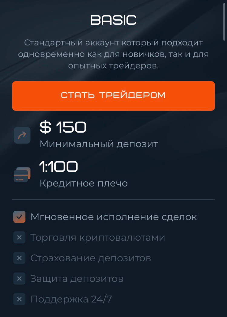 - «Базовый» со стартовым депозитом в 150 долларов и кредитным плечом 1 к 100.