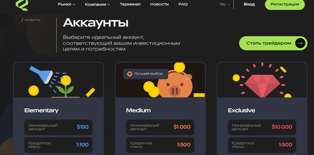 - Elementary. Стоимость от 150 долларов, кредитное плечо 1 к 1500, есть моментальное исполнение сделок.