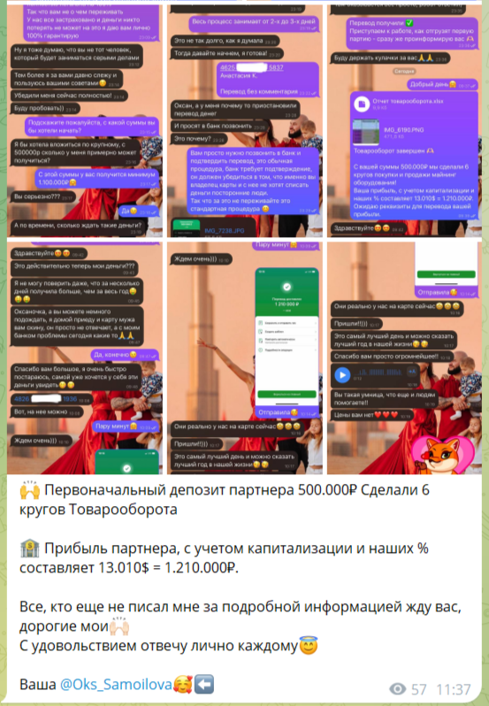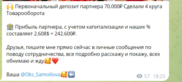 - Личная страница трейдера, выдающего себя за Самойлову, в Телеграмм: Oks Samoilova.