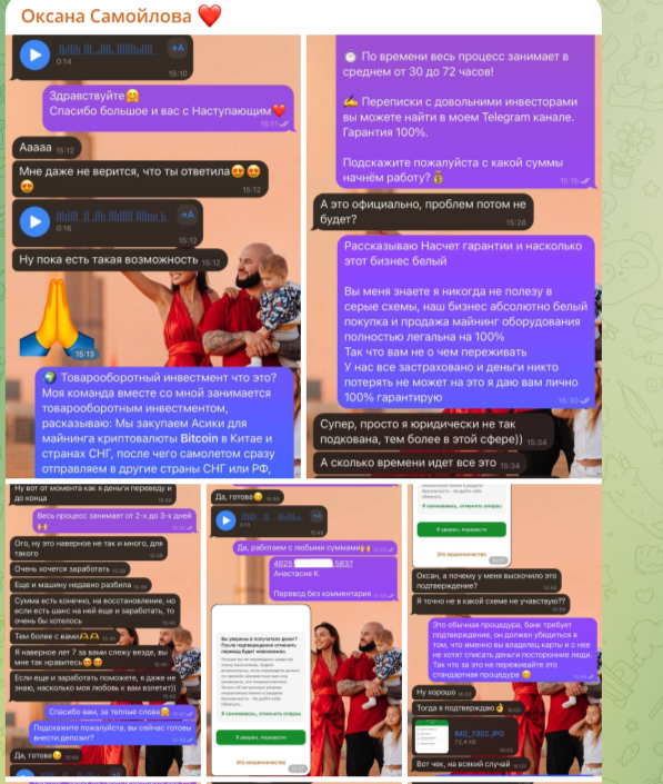 Канал в Телеграмм «Оксана Самойлова Инвестиции » предлагает делать вложения в криптовалюту, но аккаунт не принадлежит известному блогеру. По словам людей, прикрывающихся личностью жены Джигана, команда опытных и известных трейдеров закупает Асики для майнинга Bitcoin в Китае и странах СНГ, а потом выгодно их продаёт. Эта статья посвящена детальному разбору деятельности трейдера, а также мы узнаем, реально ли заработать по её сигналам.