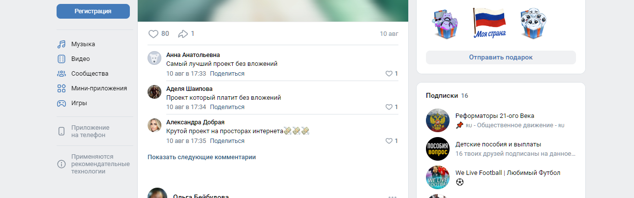 Под постами на канале публикуются только положительные комментарии пользователей. Но большого количества желающих участвовать в этой финансовой пирамиде не наблюдается.