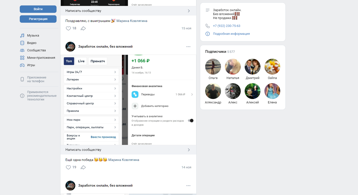 Аферисты максимально шифруются и запутывают следы. Только через поиск «Яндекса» удалось выйти на основной канал этого проекта «Заработок онлайн, без вложений» в VK. На него подписано 5 577 человек.