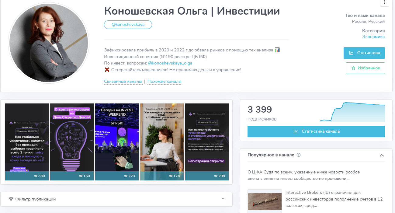 - Телеграмм канал Ольги Коношевской появился в 2020 году. На момент написания статьи на него подписано 3400 человек, комментарии открыты, посты читает почти половина подписчиков. В своем Телеграмм Ольга Коношевская выкладывает обзоры рынка, новости экономики и рекламирует курсы.