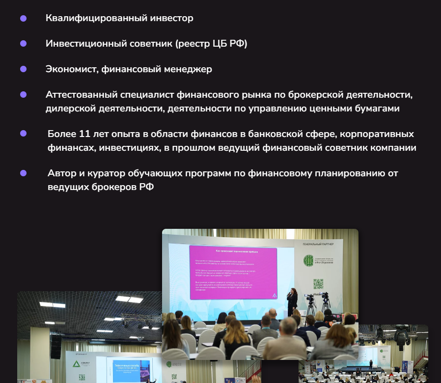 Ольга Коношевская — инвестор и наставник, работает как ИП, имеет аттестат квалифицированного трейдера и внесена в реестр ЦБ РФ как инвестиционный советник. Однако все это не гарантирует качественного обучения и возможности самостоятельно инвестировать после прохождения курсов, так как Ольга никак не доказывает собственные успехи — не ведет верифицированную статистику или публичный портфель. Минусы: