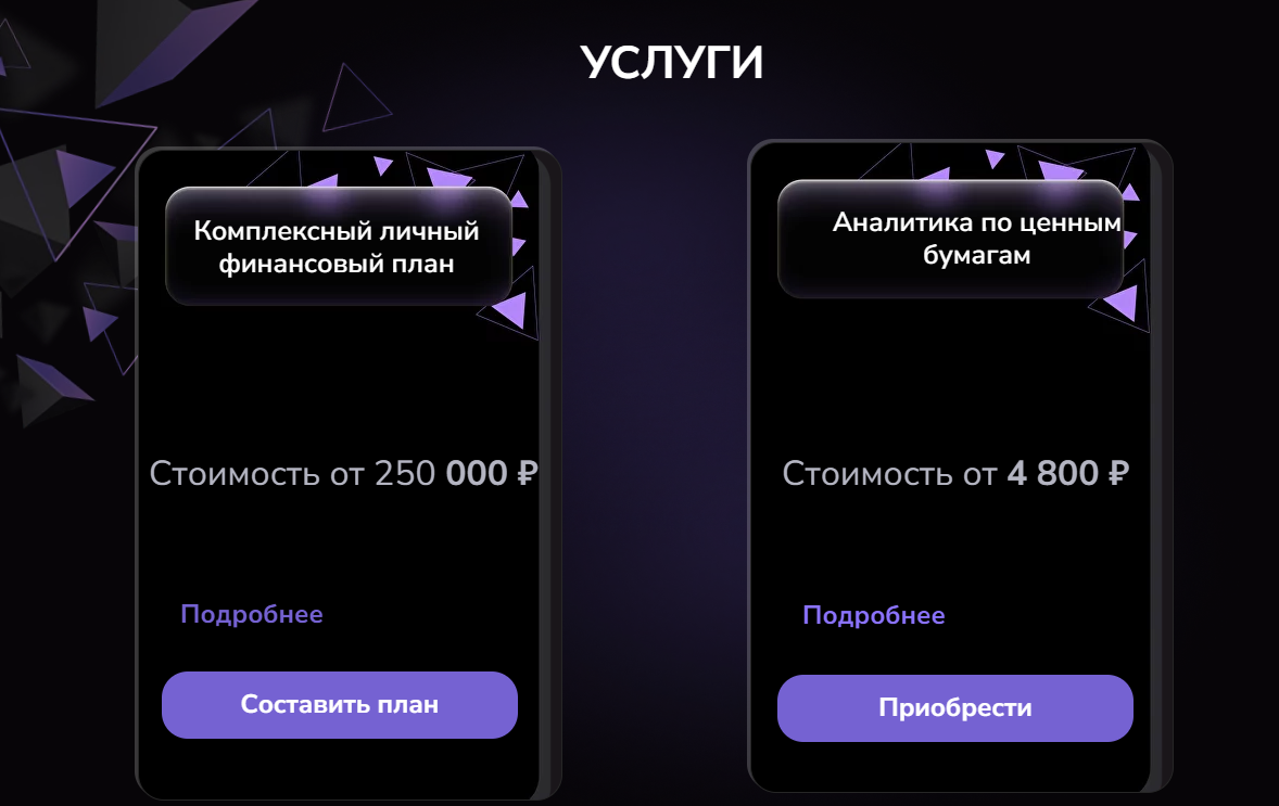 - Комплексный личный финансовый план — разработка финансового плана и сопровождение на протяжении 4 кварталов. Подойдет тем, кто хочет накопить крупную сумму, но не знает, как достичь финансовых целей. Стоимость от 250 000 рублей.