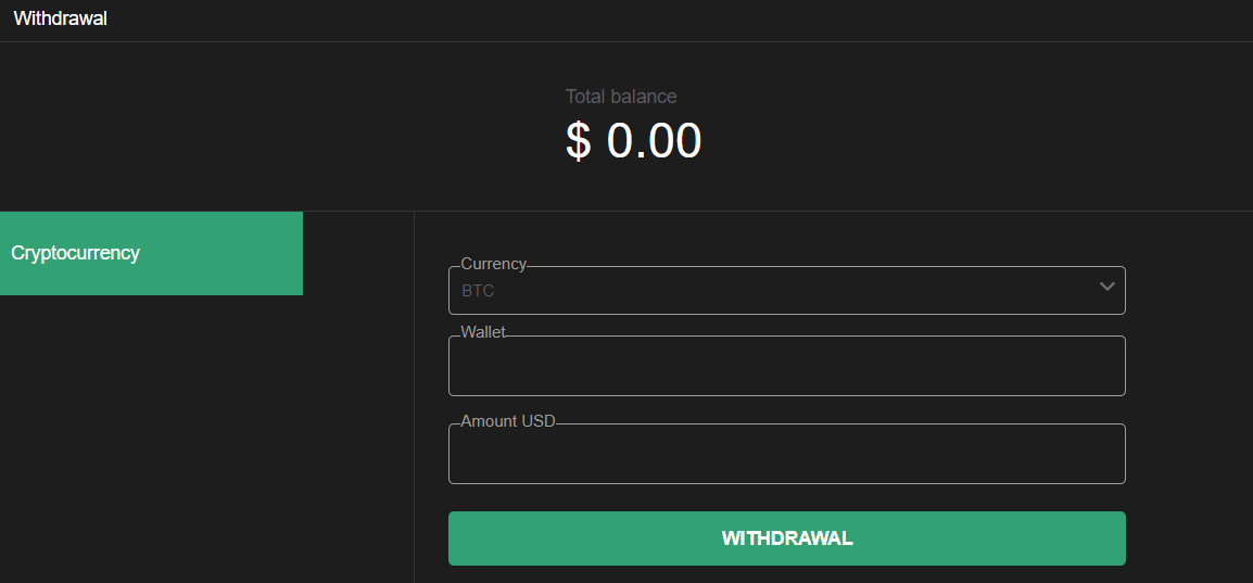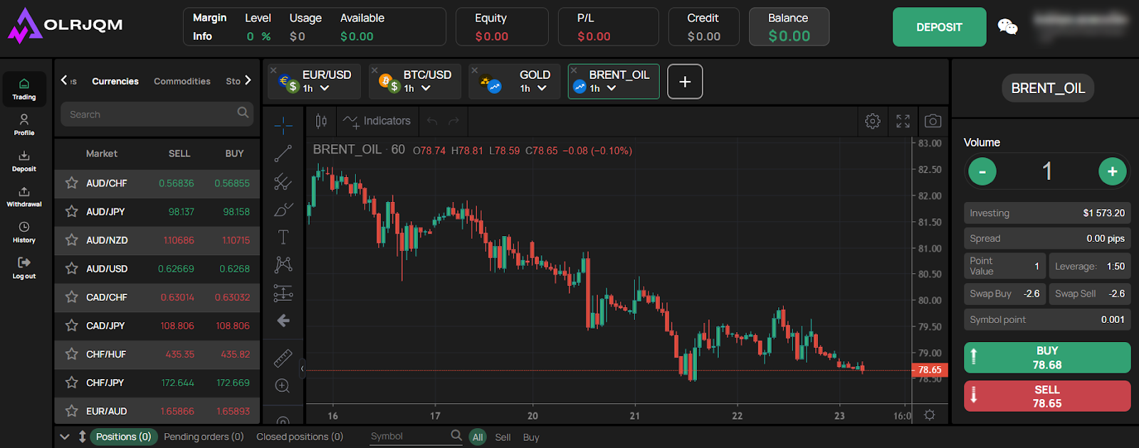 Этот сайт брокера Olr jqm представляет собой терминал с различными видами активов. Для любого вида аккаунта для торговли доступны акции, инструменты валютного рынка и разнообразные товары и ресурсы, например, какао. Торговать криптовалютой и ценными металлами можно только опытным пользователям в трейдинге. Биржевого стакана, где можно увидеть спред, нет. Пользователям доступен только график с текущими ценами.В терминале нет возможности открыть демо-счет или пройти обучение. Зато ярко выделяется кнопка «Внесение депозита». Пополнить баланс можно исключительно криптовалютой. Это является одним из признаков, что терминал брокера olrjqm com является скамом, поскольку пользователю приходится перевести деньги на анонимный, а не официальный счет. Вывести средства «можно» также только на криптовалютный кошелек.