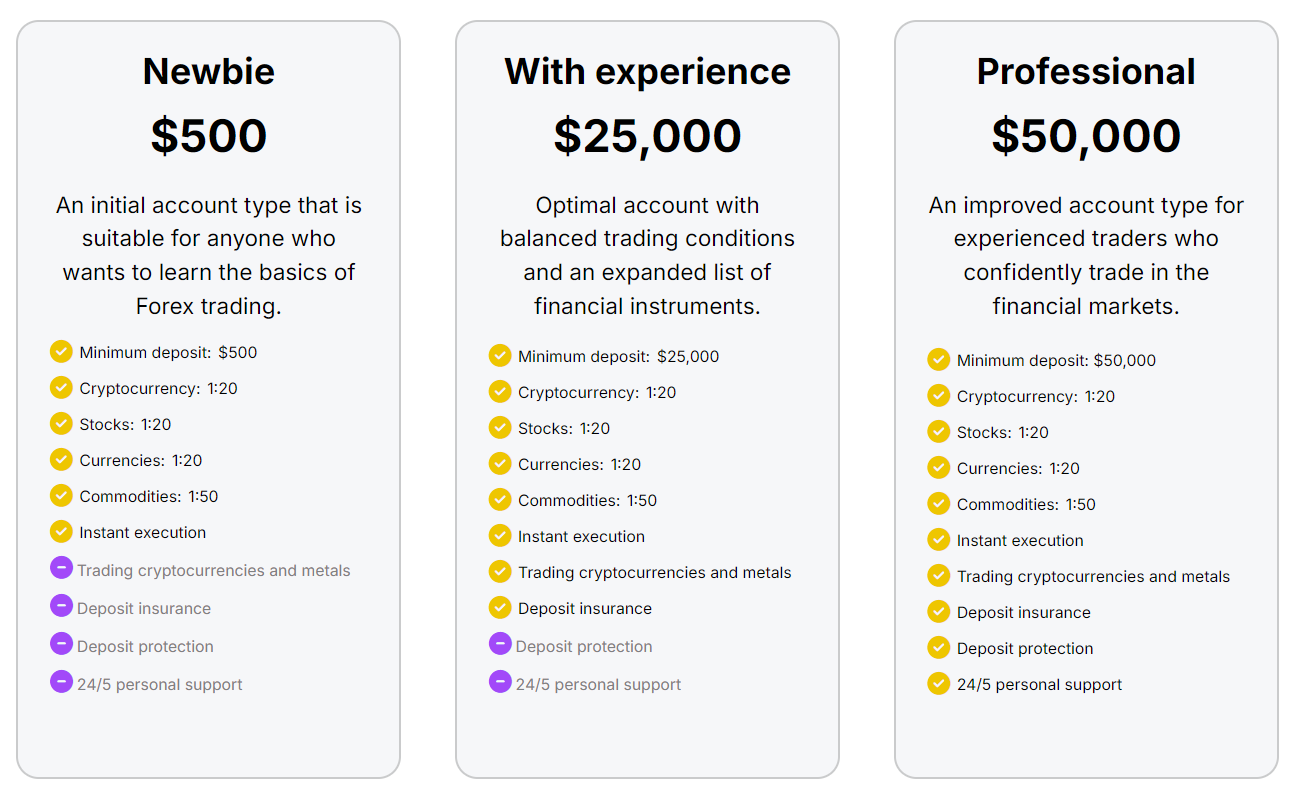 При регистрации инвестор может выбрать один из трех аккаунтов: для начинающих, для опытных трейдеров или для профессионалов.